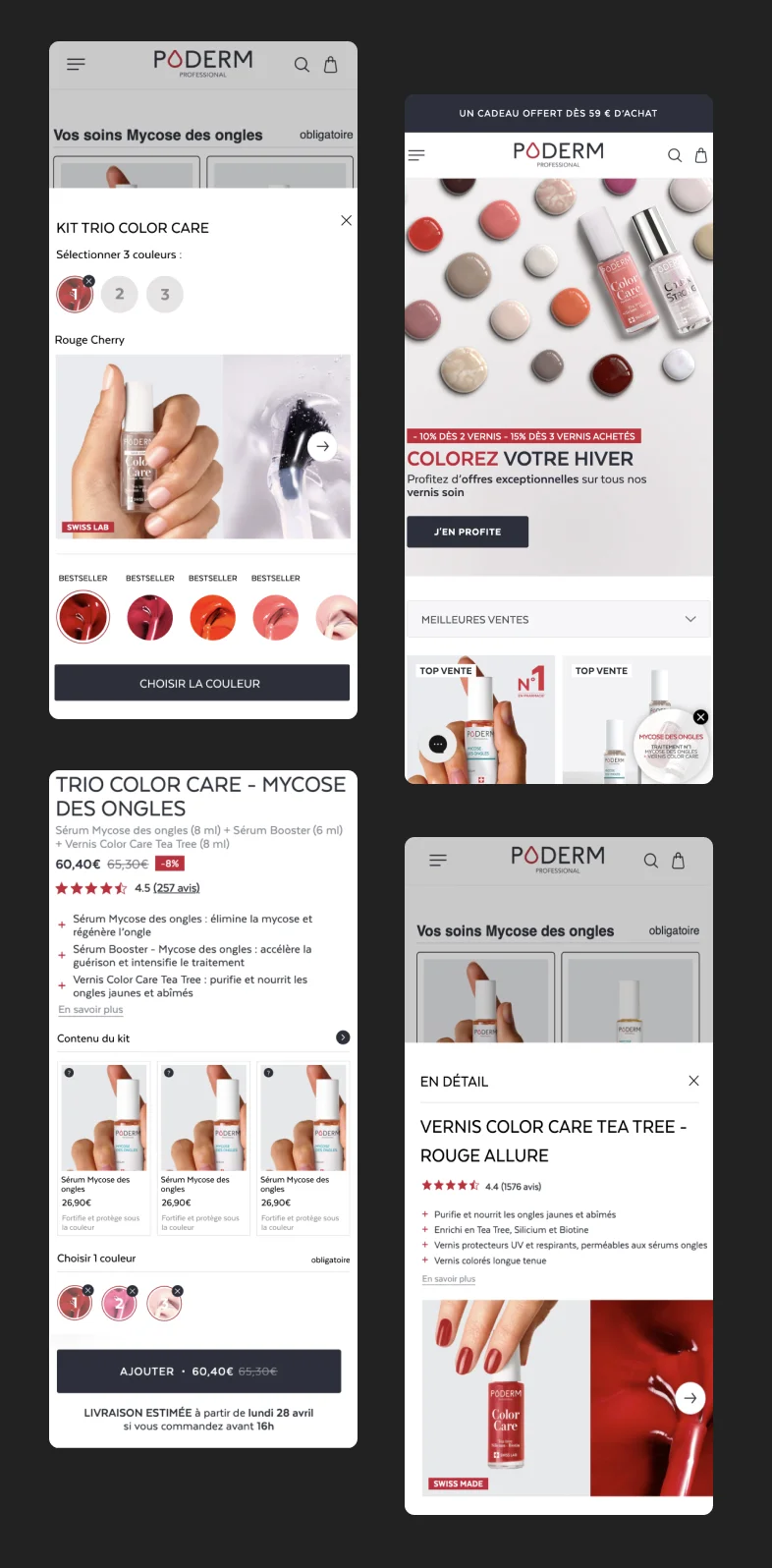 Pour PODERM, marque spécialisée dans les soins et vernis, le projet ne portait pas sur une refonte complète du site e-commerce, mais sur un travail approfondi autour des fiches produits des packs et des routines. L’enjeu principal était de rendre compréhensible une offre composée de kits de base, de vernis et de couleurs, tout en conservant une expérience fluide et intuitive pour l’utilisateur.