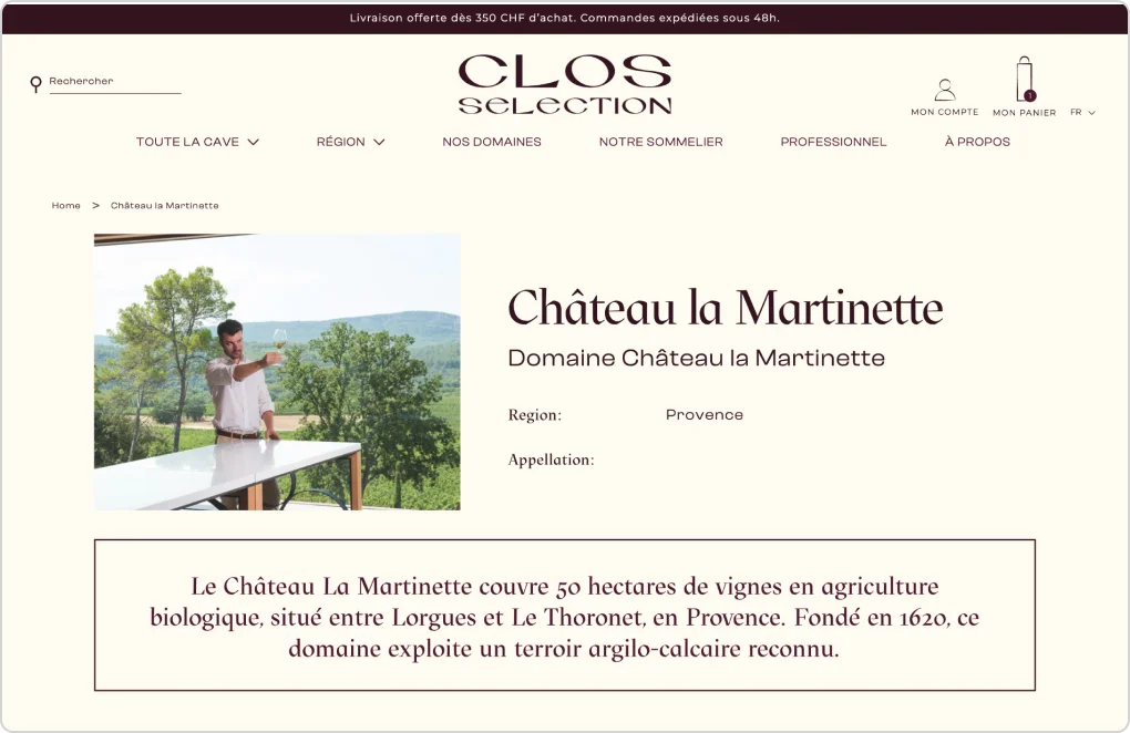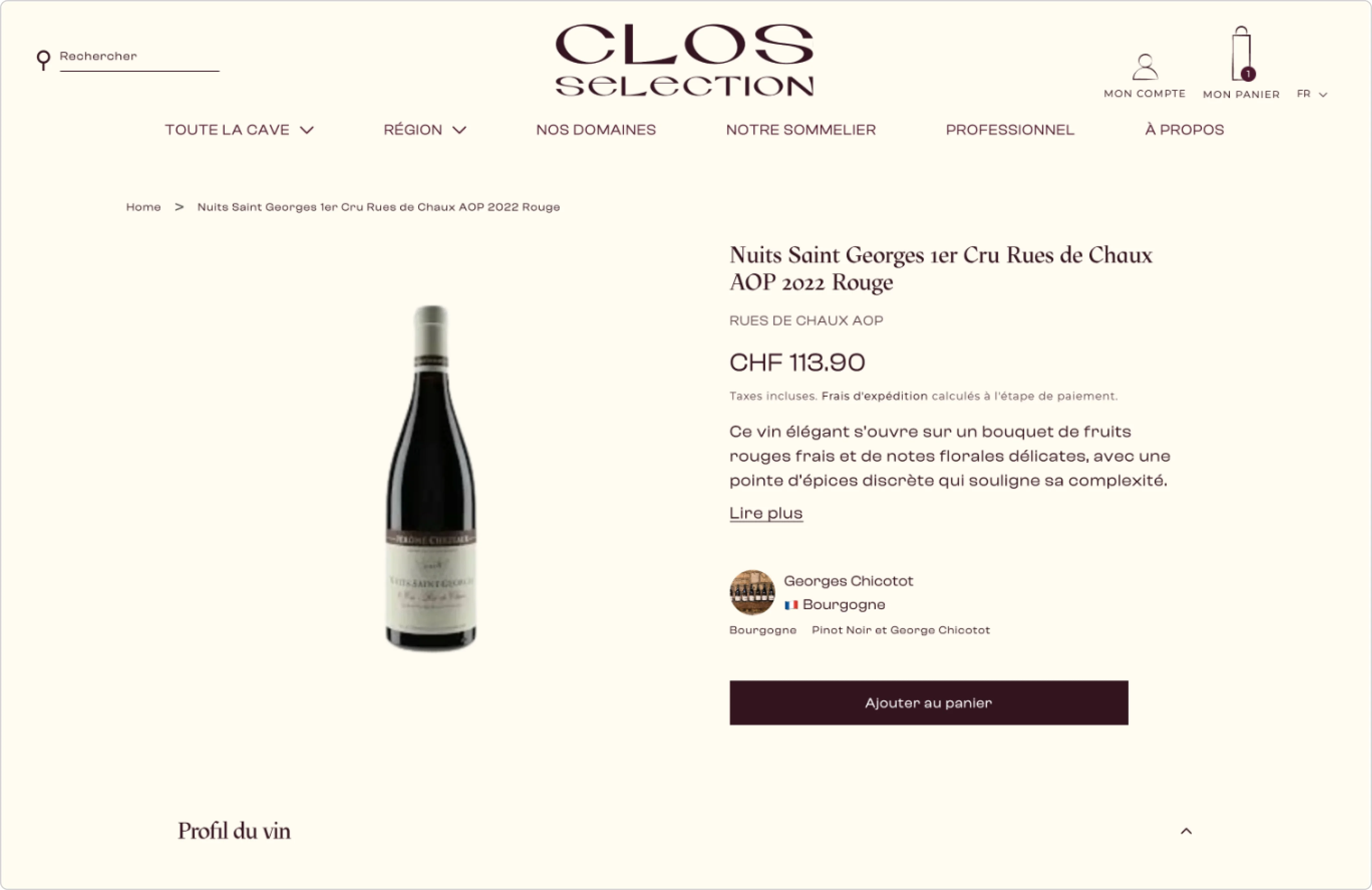 La conception de l’interface a été pensée pour accompagner tous les profils d’acheteurs, qu’ils découvrent la marque pour la première fois ou qu’ils soient déjà familiers de l’univers Clos Selection. Cette approche s’inscrit dans une logique de UX/UI e-commerce orientée conversion, en cohérence avec les bonnes pratiques de la création de site e-commerce Shopify.