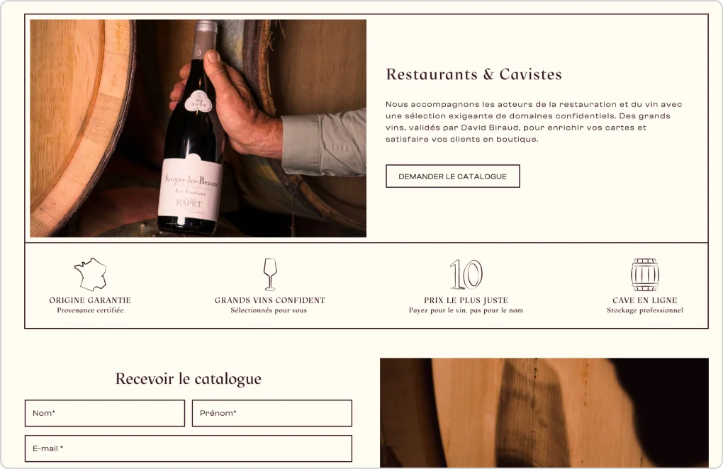 Une attention particulière a été portée à la gestion des produits, avec des ventes proposées en lots tout en conservant une gestion de stock individualisée par bouteille. Cette organisation permet de concilier clarté côté utilisateur et cohérence côté back-office. Le site a également été connecté à Odoo afin d’assurer une synchronisation fluide des données et de structurer durablement l’activité e-commerce.