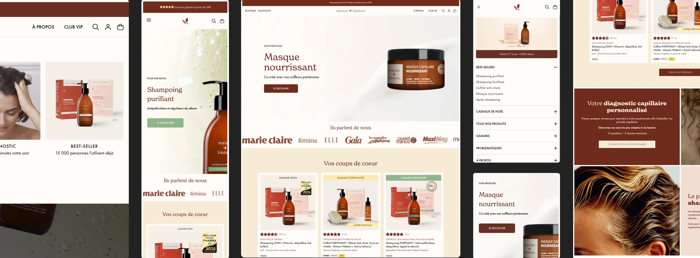 En complément de la navigation, le hero principal de la page d’accueil a été entièrement retravaillé afin de mieux positionner l’univers de Maison Hadenn et de clarifier immédiatement la proposition de valeur. Le hero joue un rôle clé dans l’orientation des utilisateurs et dans la compréhension rapide de l’offre cosmétique proposée.
