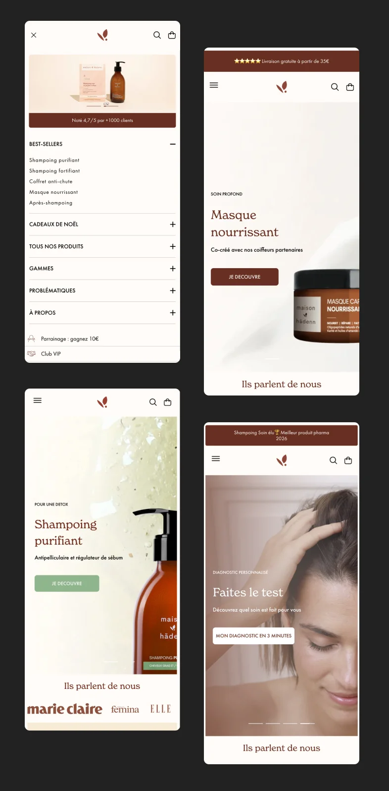 Pour Maison Hadenn, marque spécialisée dans les cosmétiques, l’intervention a porté sur l’optimisation de la navigation du site e-commerce Shopify, avec un objectif clair : faciliter l’orientation des utilisateurs dès leur arrivée sur le site. Le menu existant ne permettait pas de structurer efficacement l’offre ni de guider les visiteurs selon leurs besoins ou leurs attentes spécifiques.