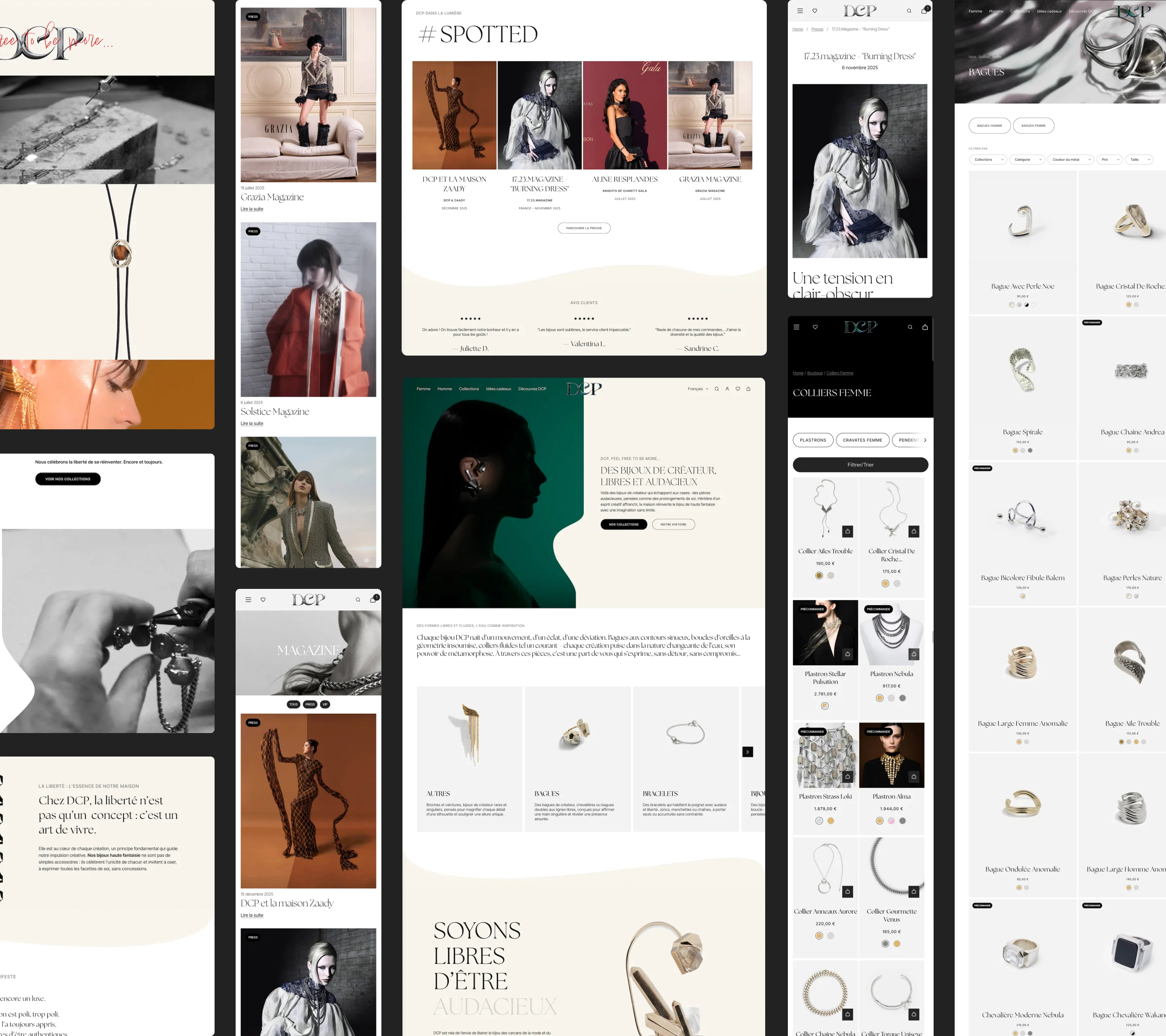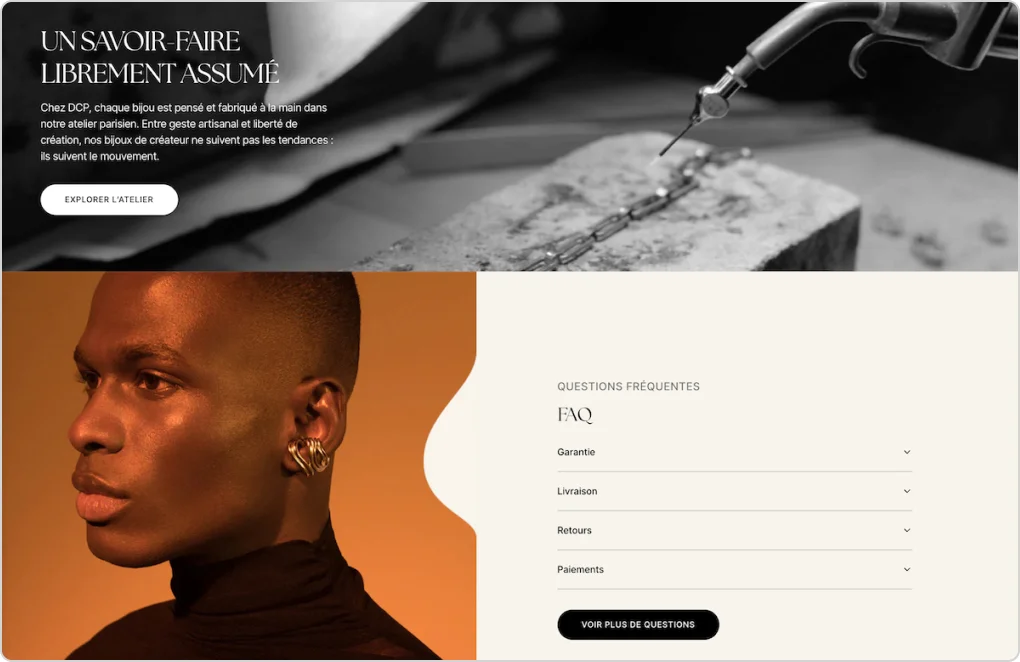 La marque DCP, spécialisée dans les bijoux premium, disposait déjà d’un site e-commerce Shopify, mais celui-ci ne répondait plus pleinement aux enjeux actuels de lisibilité, de parcours utilisateur et de connexion entre le digital et les boutiques physiques. Le projet avait pour objectif de repenser en profondeur l’expérience e-commerce afin de proposer un parcours plus clair, plus structuré et mieux aligné avec les usages omnicanaux.